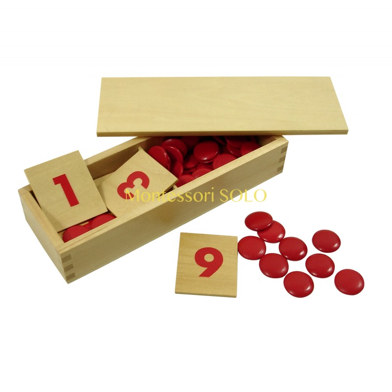 Drewniane płytki z cyframi i drewniane żetony. W zestawie jest drewniane pudełko.